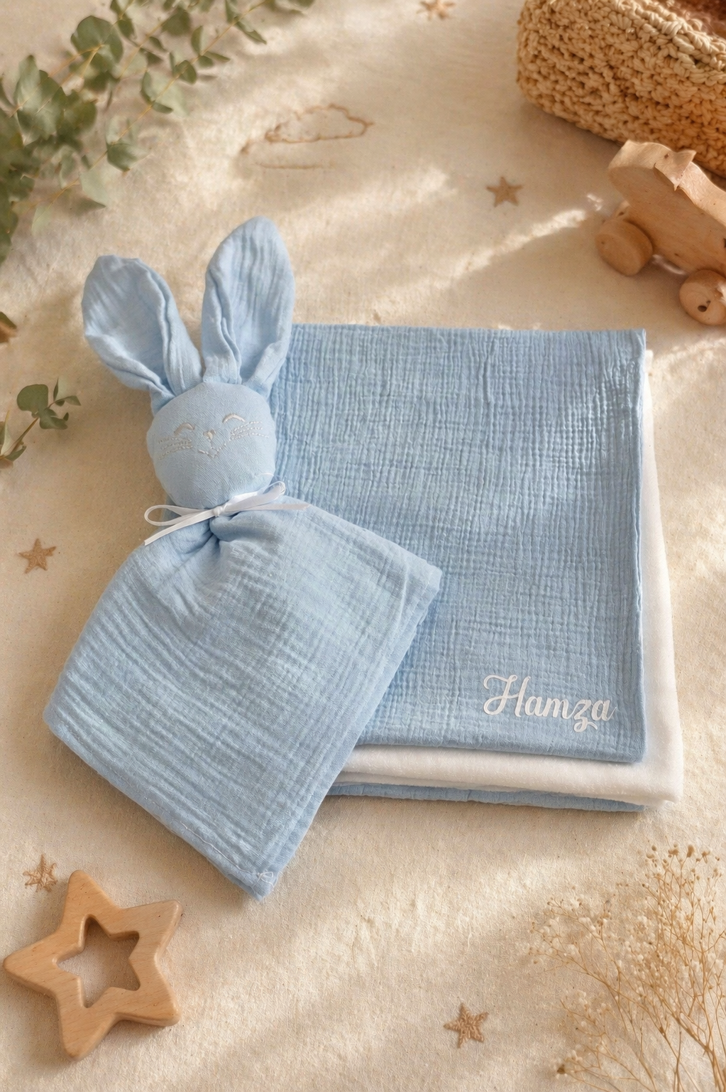 Doudou et couverture en gaze de coton personnalisée - Plusieurs coloris disponibles
